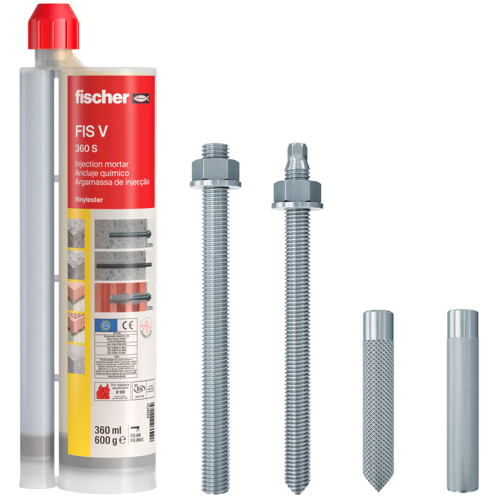 Zaprawa fischer FIS V do dużych obciążeń to uniwersalny produkt spełniający najwyższe wymagania. Zaprawa na bazie estru winylu niezawierająca styrenu wraz z licznymi elementami mocującymi jest zatwierdzona do mocowań w betonie zarysowanym i niezarysowanym oraz w murze. Jednak zaprawa iniekcyjna jest również stosowana w zatwierdzonych aprobatą systemach do połączeń zbrojeń, kotwami naprawczymi do murów fischer VBS 8, kotwami naprawczymi ścian osłonowych fischer FWS II oraz kotwami z odgrodzeniem termicznym TherMax. Wersja FIS VS LOW SPEED oferuje przedłużony czas obróbki przy wyższych temperaturach pracy lub większej głębokości otworu. Krótki czas utwardzania wersji FIS VW HIGH SPEED zapewnia szybki postęp prac nawet przy niskich temperaturach.