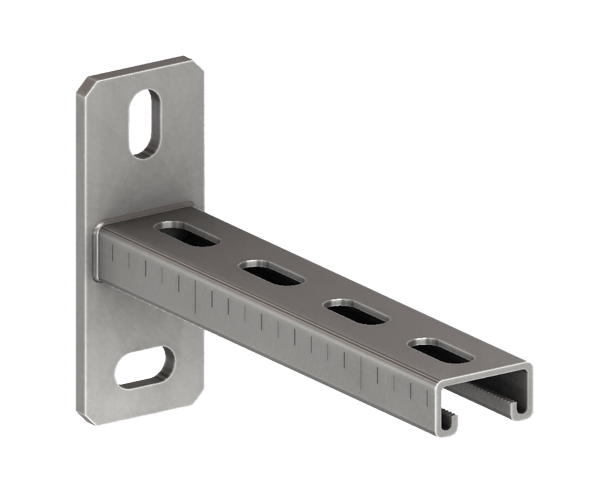 Konsole montażowe przeznaczone do średnich i dużych obciążeń. Profil typu Strut. Ocynkowane galwanicznie – grubość powłoki cynkowej ≥ 12 μm (stal S235JR). Ścianka boczna z podziałką